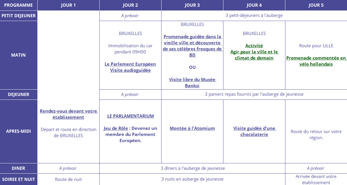 Le transport jusqu’en Belgique s’effectue en autocar de tourisme. Afin de respecter la législation du transport, il faudra prévoir l’immobilisation du car pendant 9h les jours d’arrivée et de départ.