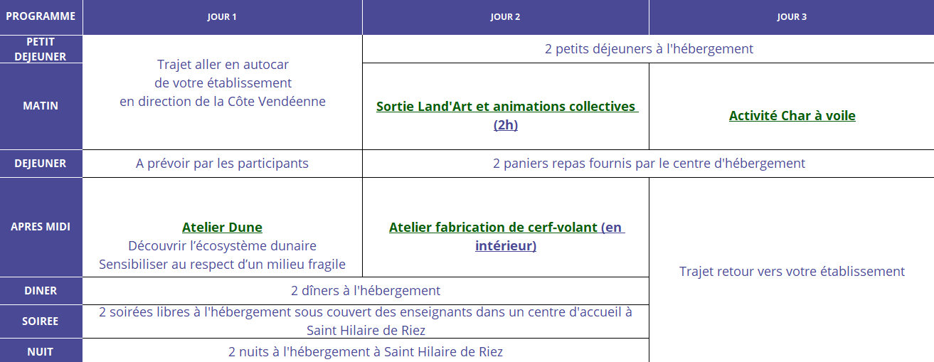 Partez à la découverte de la richesse naturelle et écologique de la Côte Vendéenne à travers un programme alliant apprentissage, cohésion et sensations. Entre exploration des dunes, activités collaboratives sur le thème de l’écologie et moments sportifs en plein air, vos élèves vivront une expérience immersive et enrichissante.